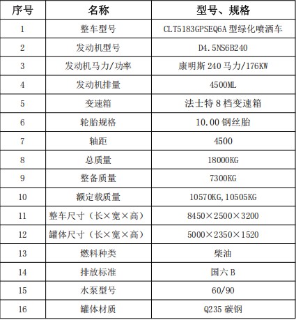 1、整車型號:CLT5183GPSEQ6A型綠化噴灑車